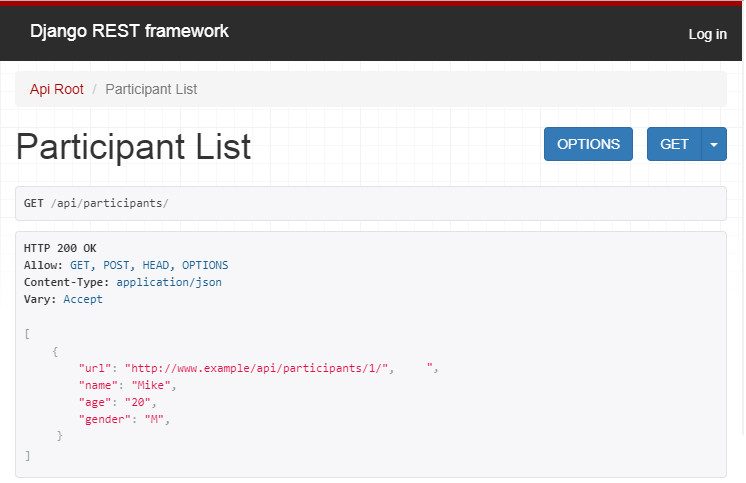 # app/serializers.py from rest_framework import serializers from app.models import Participant class ParticipantSerializer(serializers.HyperlinkedModelSerializer): class Meta: model = Participant fields = ('url', 'name', 'age', 'gender')views.py